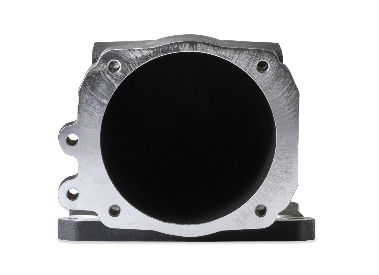 This cast EFI intake elbow allows the use of Ford throttle bodies on any intake manifold w/ the 4150 mounting flange. Slotted mounting holes & dual throttle cable mounting bracket bosses allow the elbow & throttle body to be mounted forward, sideways, or rearward. Features (4) vacuum ports, MAP sensor port, machined / port matched to 4150 gasket, and 100° throttle body angle for extra hood clearance. Includes MAP sensor port cover, gaskets & hardware.