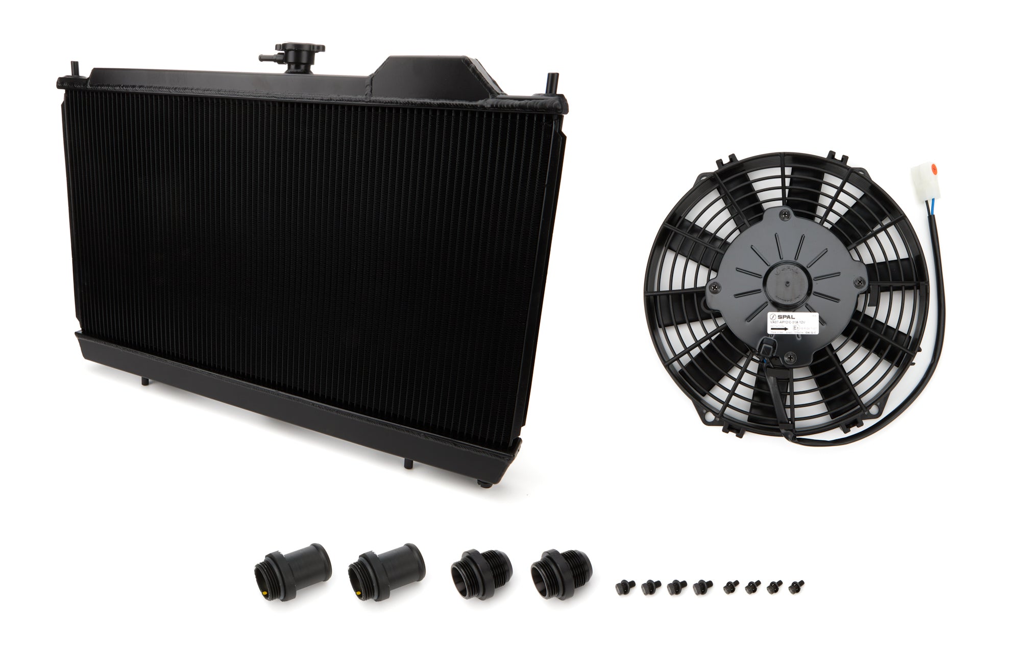 Radiator - 27.625 in W x 14.75 in H x 1.25 in D - Single Pass - Driver Side Inlet - Driver Side Outlet - Fan / Shroud Included - Aluminum - Black Powder Coat - Mitsubishi Lancer 2003-06 - Each