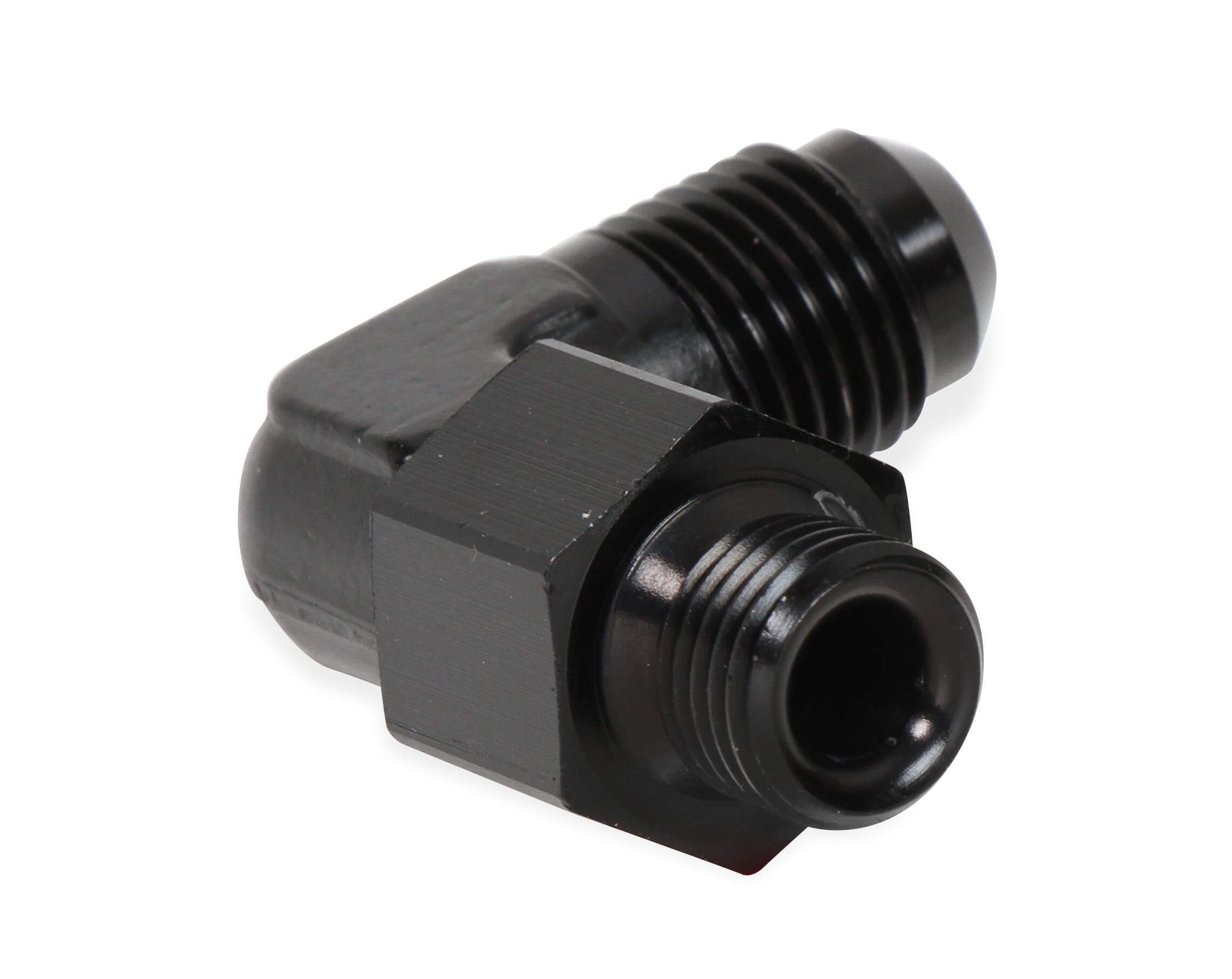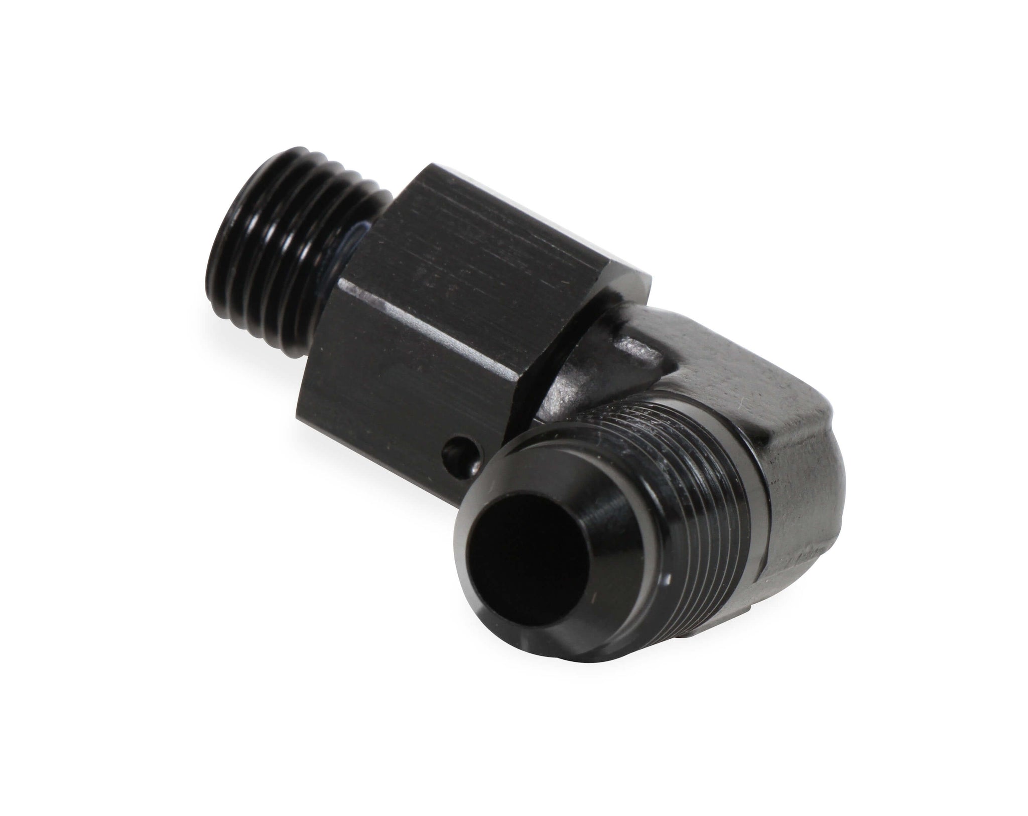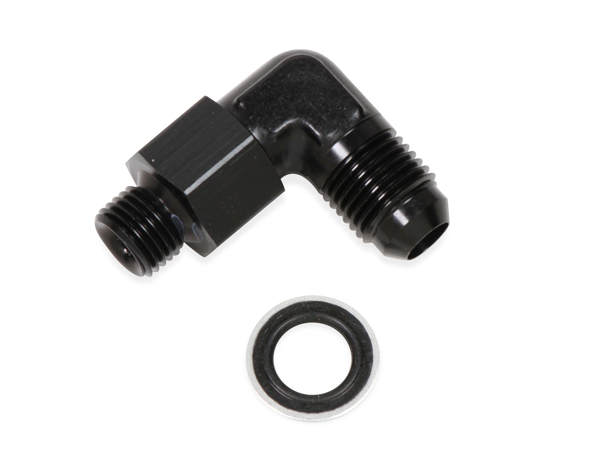 Fitting - Adapter - 90 Degree - 6 AN Male to 12 mm x 1.50 Male O-Ring Swivel - Aluminum - Black Anodized - Each
