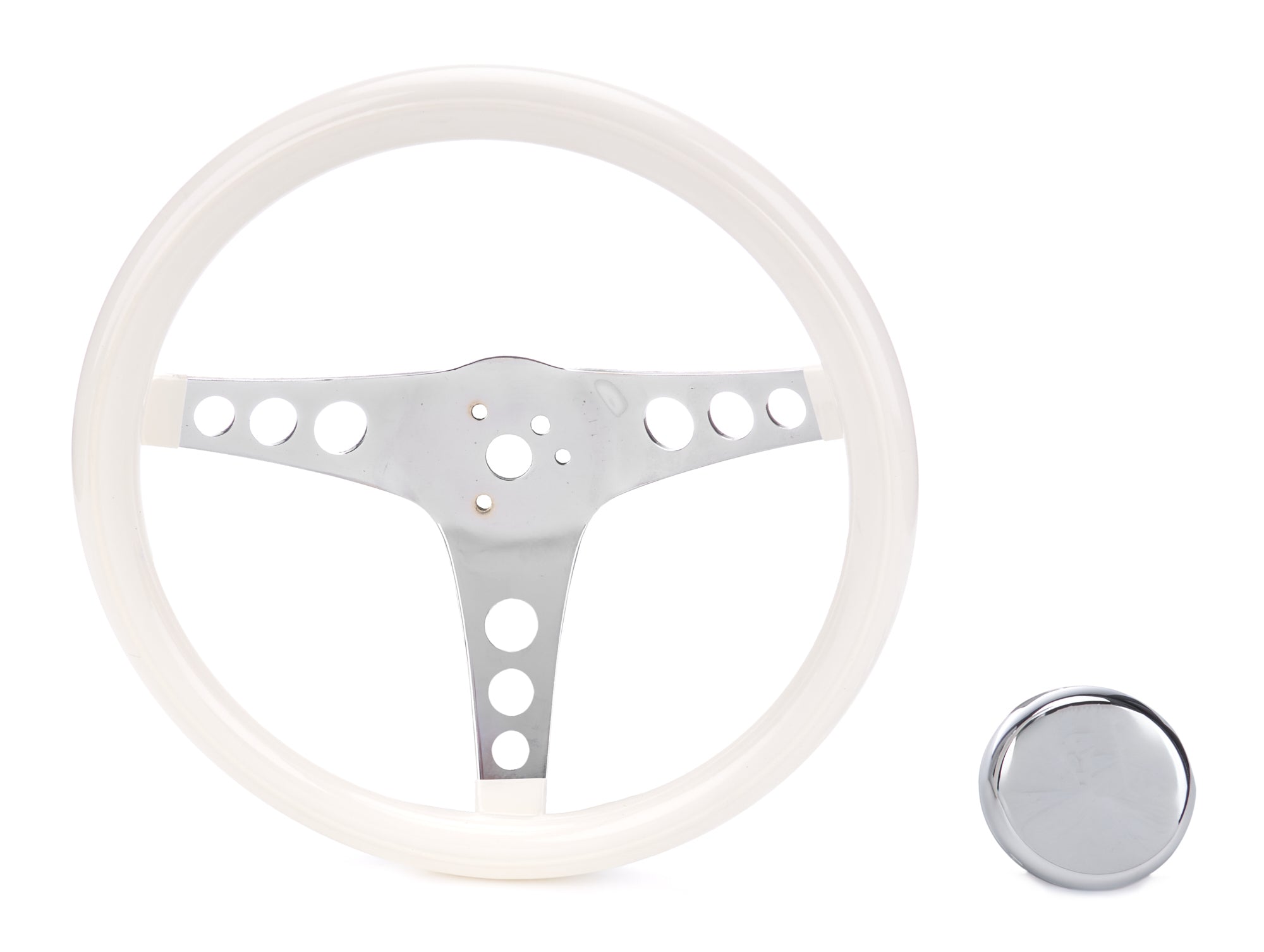 Steering Wheel - Classic Series - 12.5 in Diameter - 3.5 in Dish - 3-Spoke - White Foam Grip - Steel - Chrome - Each