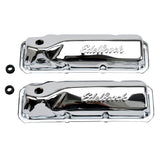 Valve Cover - Signature Series - Short - Baffled - Breather Hole - Grommets - Edelbrock Logo - Steel - Chrome - Ford Cleveland / Modified - Pair